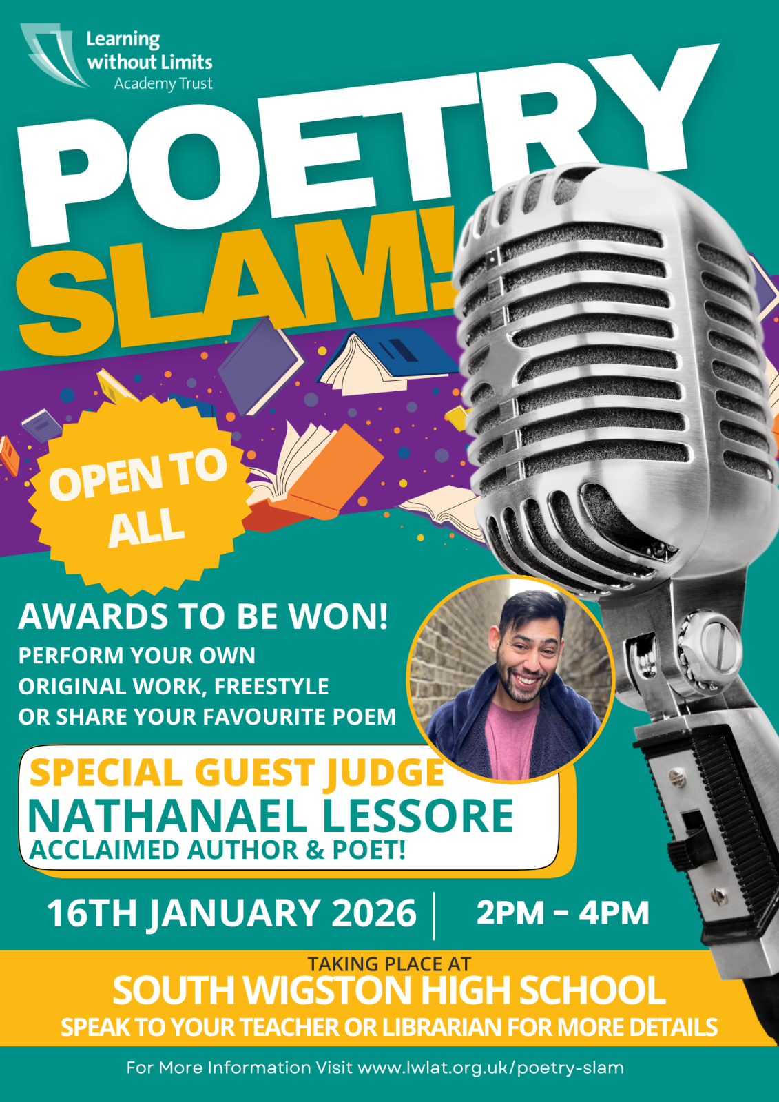 We are busing planning our 3rd Annual Poetry Slam for Friday 16th January 2026 taking place at South Wigston High School from 2:00 -4:00pm.